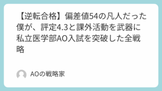 未分類 【逆転合格】偏差値54の凡人だった僕が、評定4.3と課外活動を武器に私立医学部AO入試を突破した全戦略 はじめまして。このブログの管理人です。 今、この記事を読んでいるあなたは、もしかしたらこんな悩みを抱えていませんか?「医学部に行きたい。でも、模試の成績が全然上がらない…」 「部活や生徒会は頑張ってきたけど、受験でなんて評価されるんだろう…... 2025.09.23 未分類